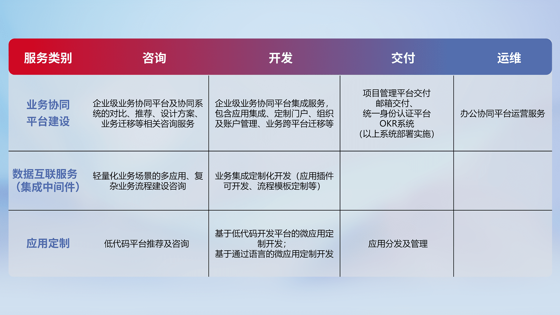 针对钉钉、、、企微、、IDaas等平台级产品提供产品的规划、、、方案、、、交付、、定制化开发等服务,,,实现如统一协同办公、、智能客户服务、、、、混合会议管理、、智能数据查询、、、、等业务场景,,实现数字化转型。。